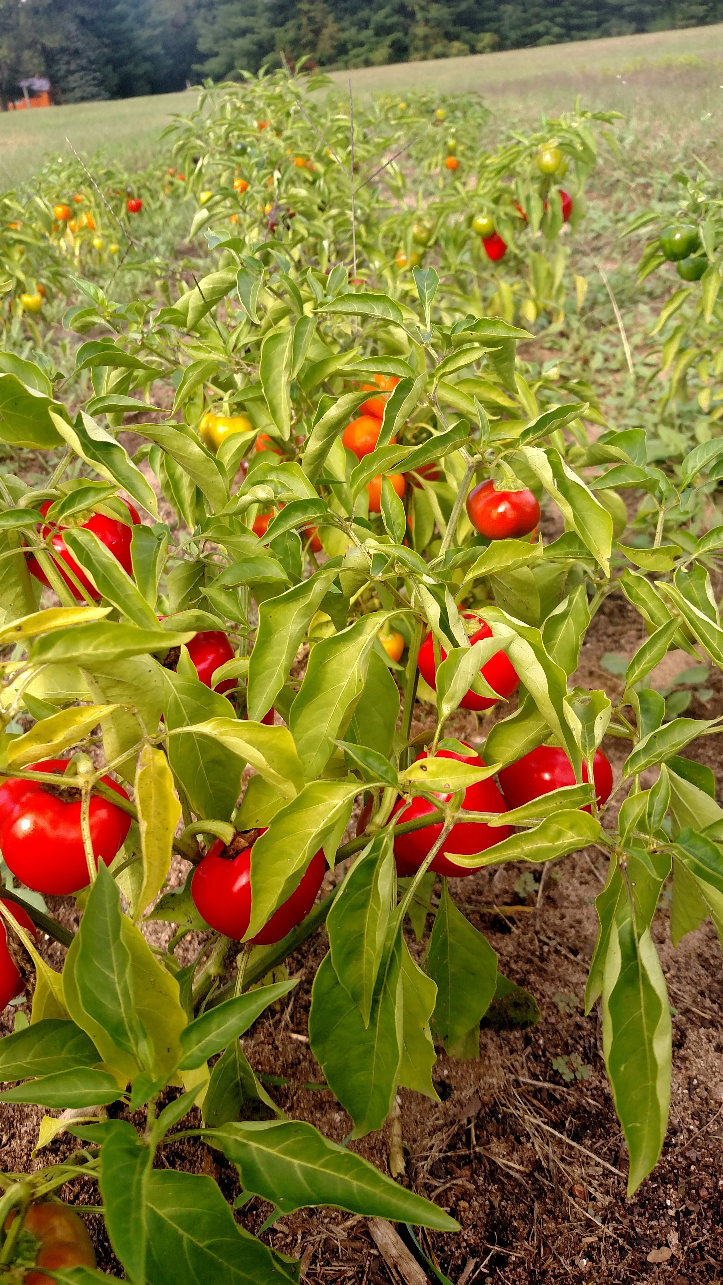 Summer: Eggplant, hot and sweet peppers, cherry and slicing tomatoes (including heirloom varieties), beans, summer squash, fragrant basil, onions, and crisp cucumbers.